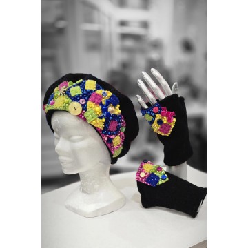 - Sublimé par trois fleurs en laine de la même couleur, strassées de cristaux Swarovski ou Préciosa posés un à un à la main.