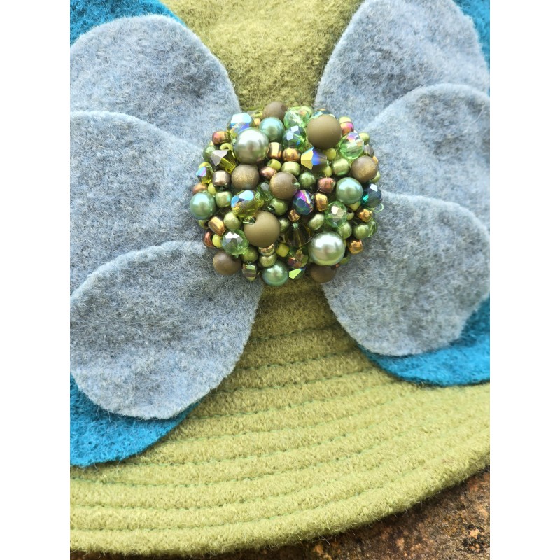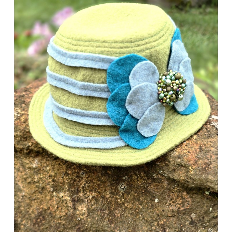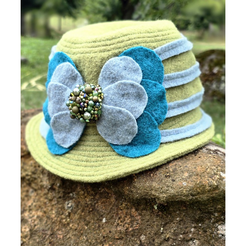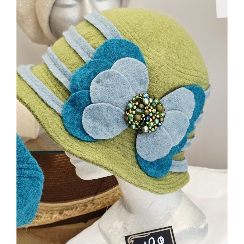 - Le bord du chapeau est relevé coté droit et garni d'une double bande bicolore agrémenté d'un liseret en cristaux Swarovski ou Préciosa