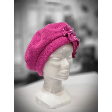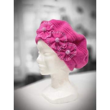 - Sublimé par trois fleurs en laine de la même couleur, strassées de cristaux Swarovski ou Préciosa posés un à un à la main.